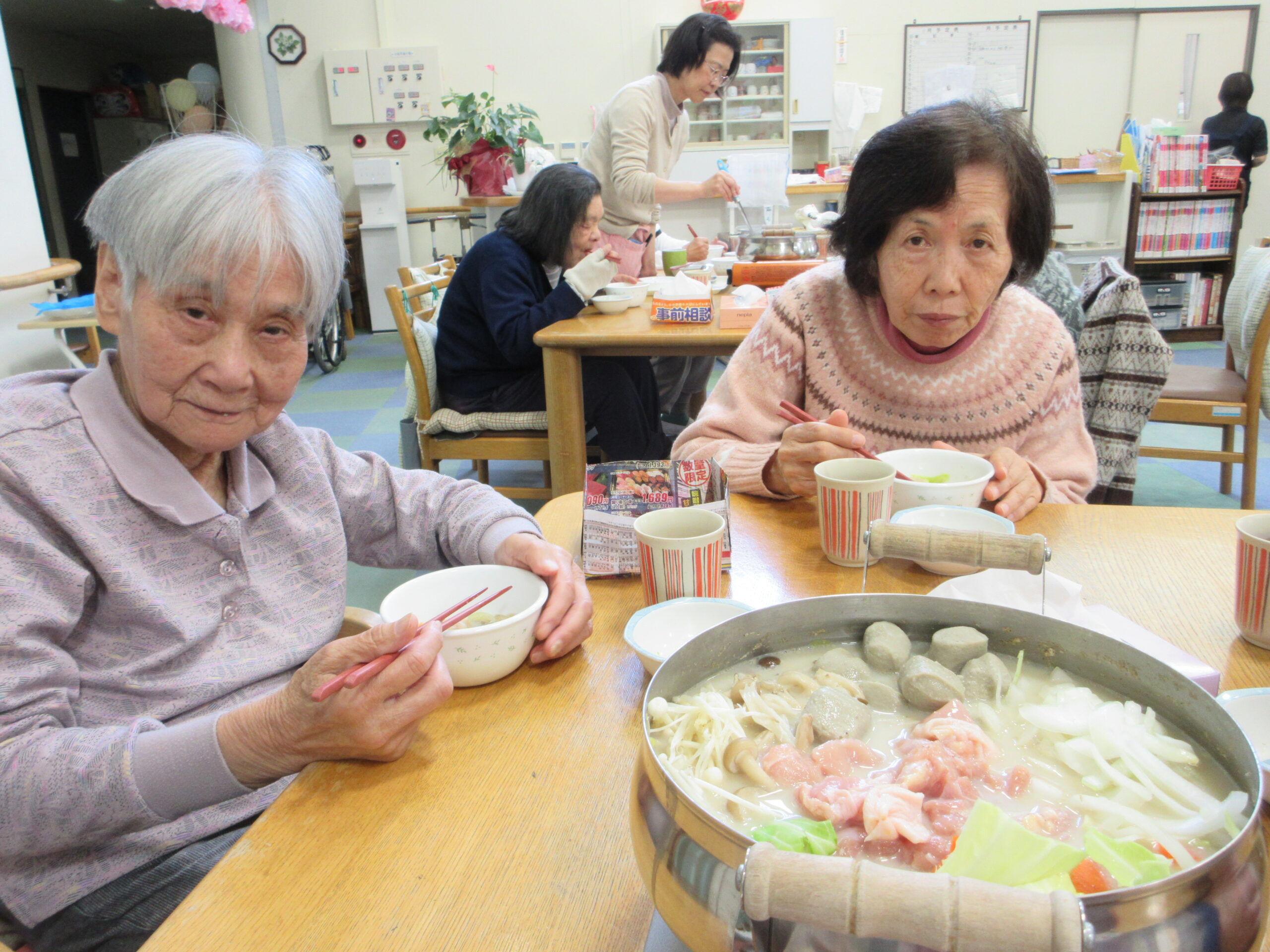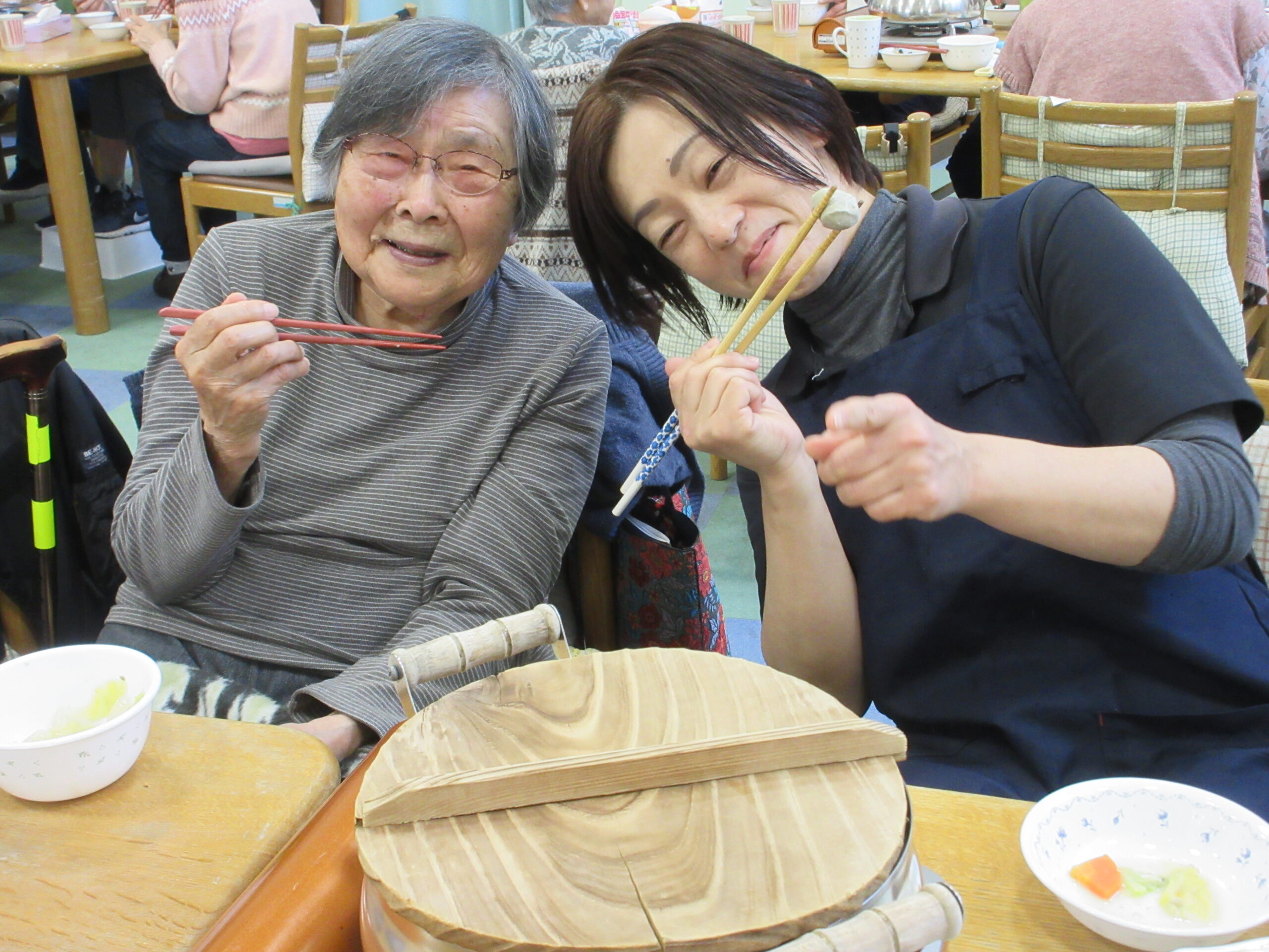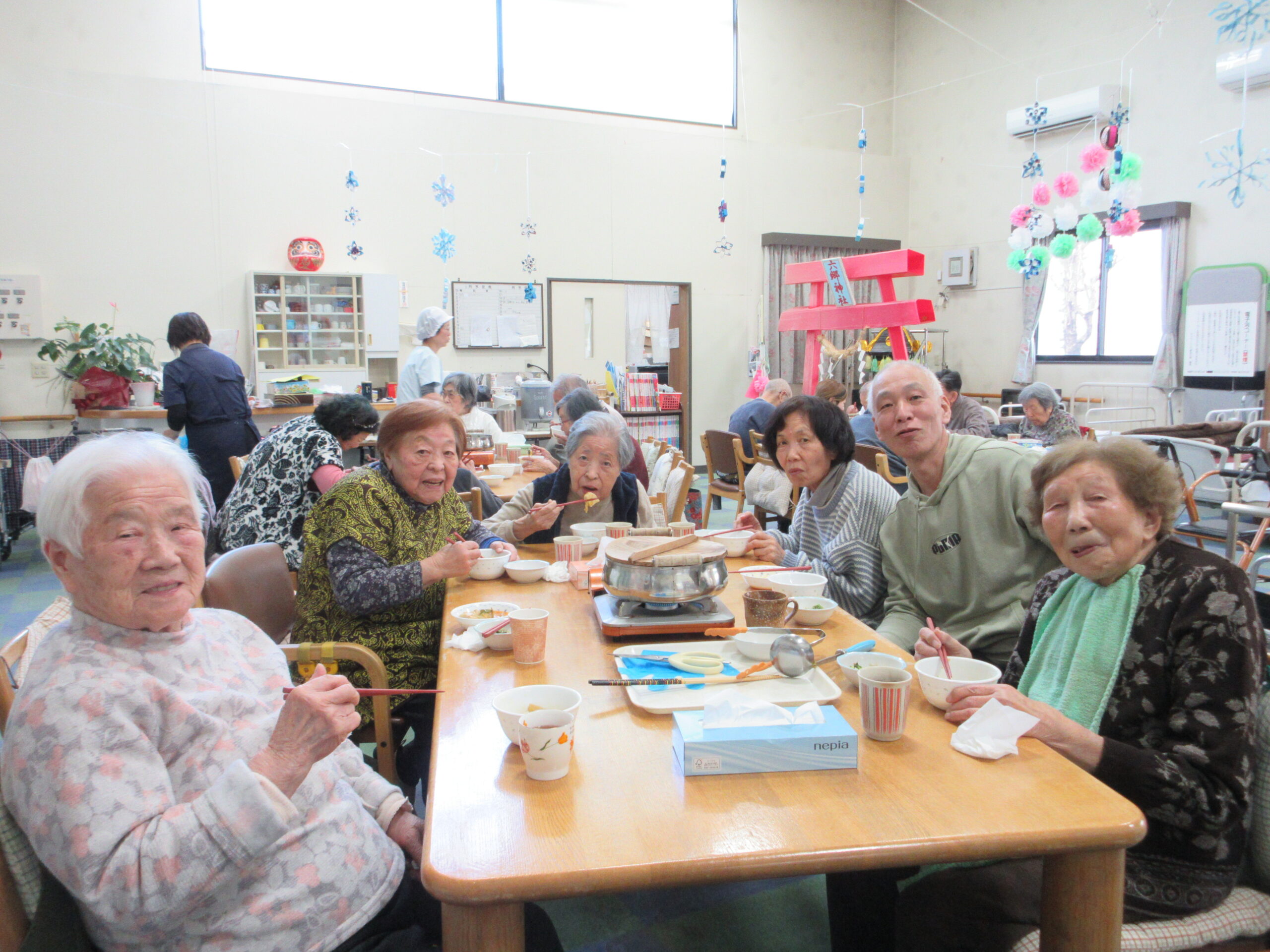 トピックス 2026年4月 ひなまつり デイサービス六郷友の家 2026.04.01 ひなまつりでは、桜餅を作ったり、ゲームをして楽しみました。 大きな顔はめパネルで写真も撮り盛り上がりました! デイサービス六郷友の家 鍋会食 デイサービス六郷友の家 2026.04.01 昼食に鍋会食を行いました。 午前中から材料を切ったり準備を行いました。 皆でお鍋を囲むっていいですよね! デイサービス六郷友の家 高栁