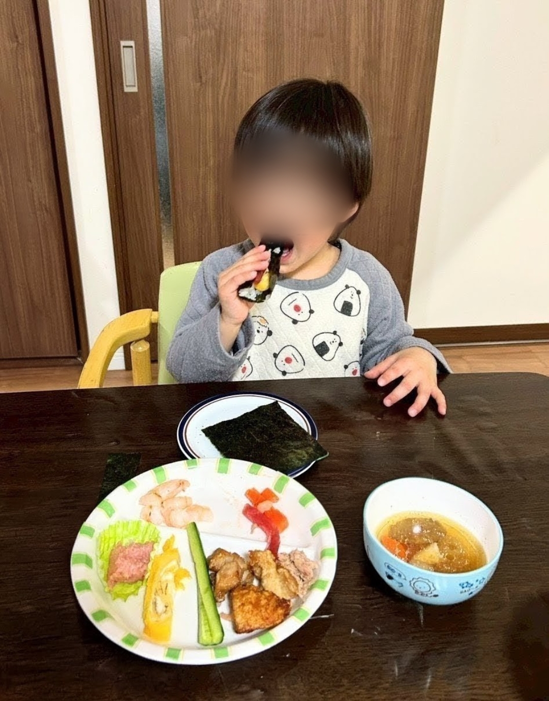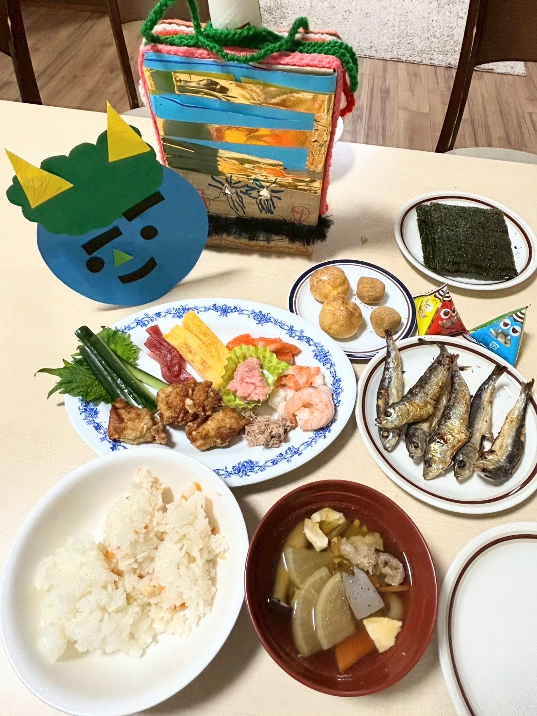 希望館の食事 児童2026.02.25 すみれユニットの節分メニュー 女の子ユニット「すみれ」では、恒例の節分を行いました。 賑やかな豆まきを終えると、自分たちで巻いた恵方巻を大きな口でパクリ! イワシもみんな食べられました✌唐揚げとデザートにシュークリームやわらび餅も付いてみんなニコニコ♪ もちろん豆も食べて、今年も無病息災を願いました。 すみれユニット 希望館の食事一覧へ