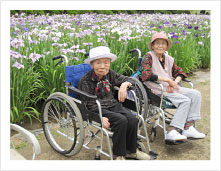 梅雨空の続く6月、たまにお天道様が顔を出せばむしむしと暑くなり、気分も盛り上がらなくなるような時期。そんなジメジメした気候に負けずに、養護老人ホームでは、毎年恒例の花菖蒲を見にでかけてきました。今回は、場所を赤堀にある花菖蒲園に移し、6月13日~23日にかけて、5組に分かれ18名のご利用者が参加されました。