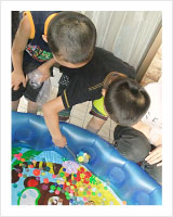 子ども達が八幡の家で暮らし始めて初めての夏。最高の思い出を作りたい!ということで、職員が全員一丸となって、子ども達と思いきり楽しめる夏祭りを企画。すいか割りやヨーヨー釣り、ペットボトルボーリングなどのブースが用意され、すいか割りでは、小さい子どもがすいかを割れるよう、大きい子ども達がみんなで誘導してくれました。