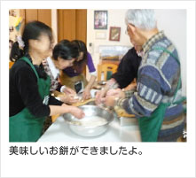 当日は寒い中でしたが、七輪で暖を取りながら、杵と臼でお餅をつきました。お隣のご主人も参加され、会場もヒートアップ!突きたてのお餅は、とっても柔らかく「入れ歯でも良く噛める」と大好評でした。