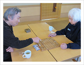 年季の入った将棋盤を前に、お茶を飲みながらの真剣勝負が始まりました。