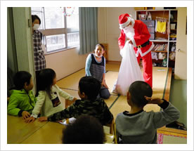 平成28年12月20日、幼児保育に突然サンタさんが来ました。幼児保育が開所して初めてのお客様です。幼児さん11人はサンタさんを見た途端、固まって数秒間身動きが取れませんでした。そしてY君の泣き声でみんな我に返りました。「キャー」「すごい」など歓待の笑い声に替わりました。「なんでサンタさんを呼んでくれたの?なんで来てくれたの?」とのM君の質問に「みんなが毎日お利口さんで頑張っているからだよ」とのサンタさんお返事でした。ひとりずつプレゼントを貰い、お家に帰ってから開けるとの約束を守って大事に嬉しそうにしておりました。「サンタさん来年も来てくださ~い。」「いい子にしているから」Kサンタ先生、ありがとうございました。来年まで元気でいて下さいね。そして、僕たちのところにプレゼント持ってきてくださいね。