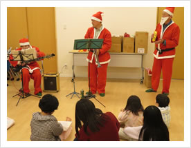 12月26日(水) ワールドメイトの3人のサンタさんが来て下さいました。クリスマスソングやトトロ等の演奏をしながら、子どもたちひとりひとりにプレゼントを手渡して下さいました。さっそく袋をのぞく子もいたり、身体を揺しながら手をたたく子もいたり、みんな嬉しそうでした。ありがとうございました。