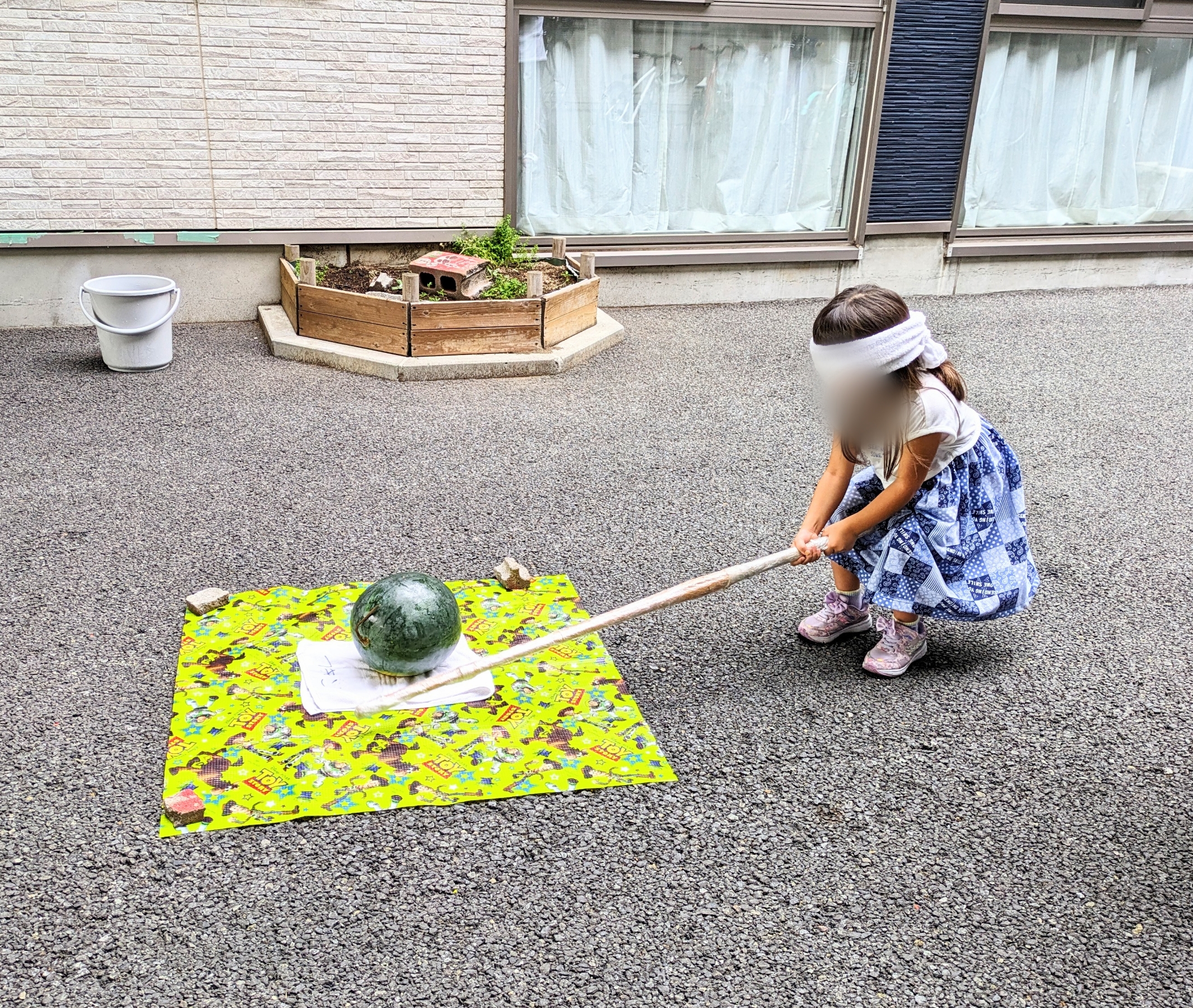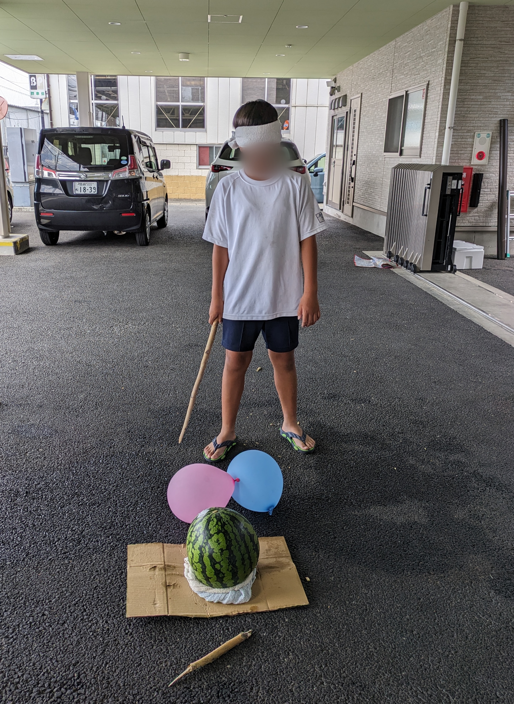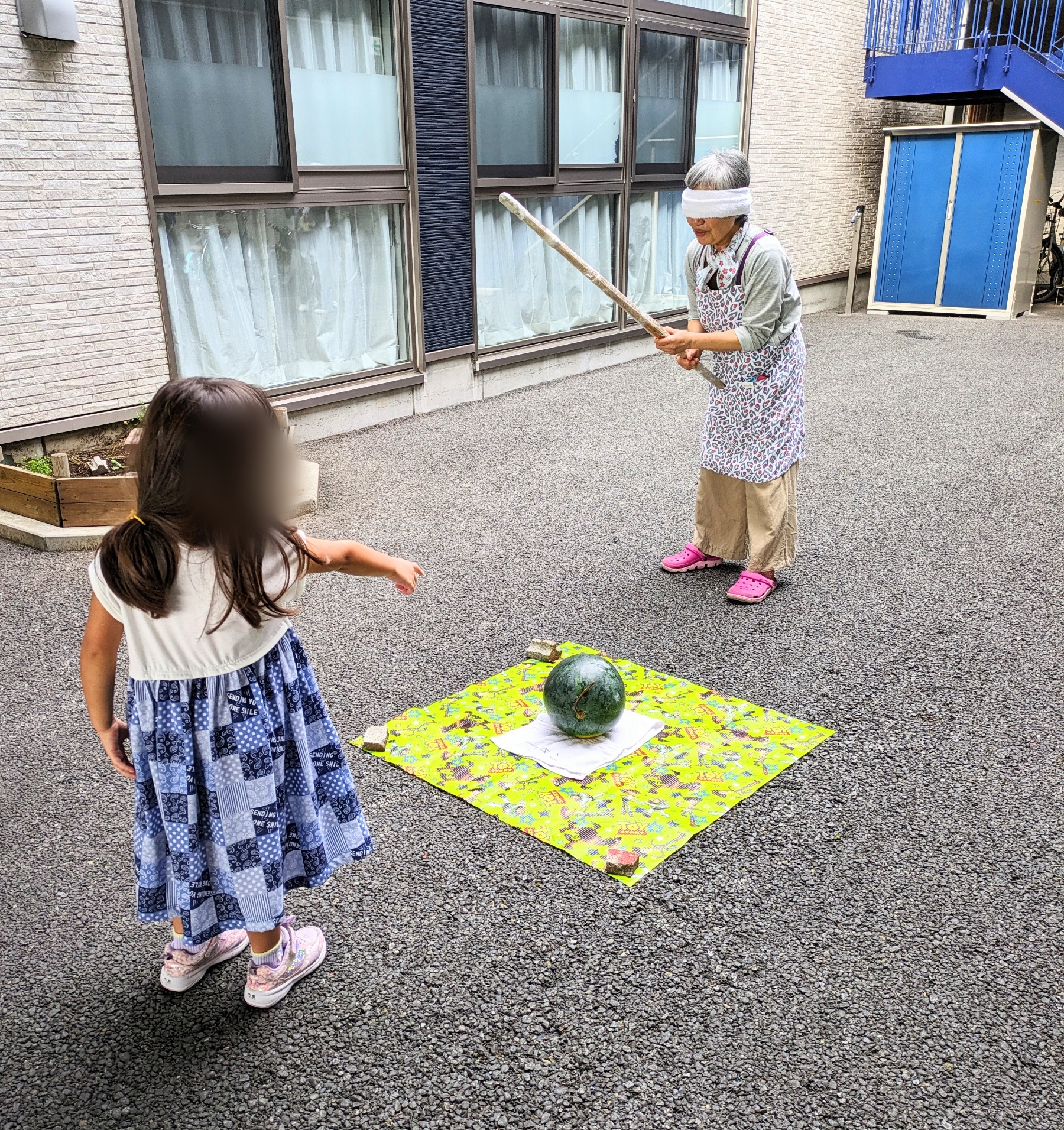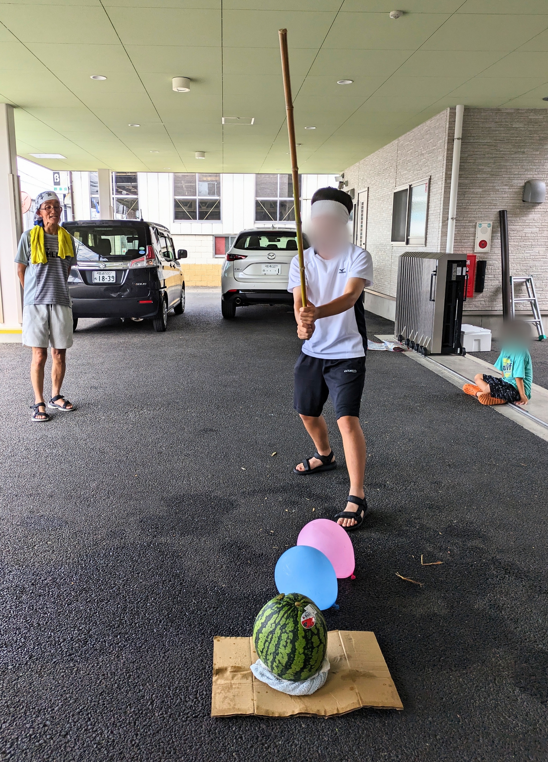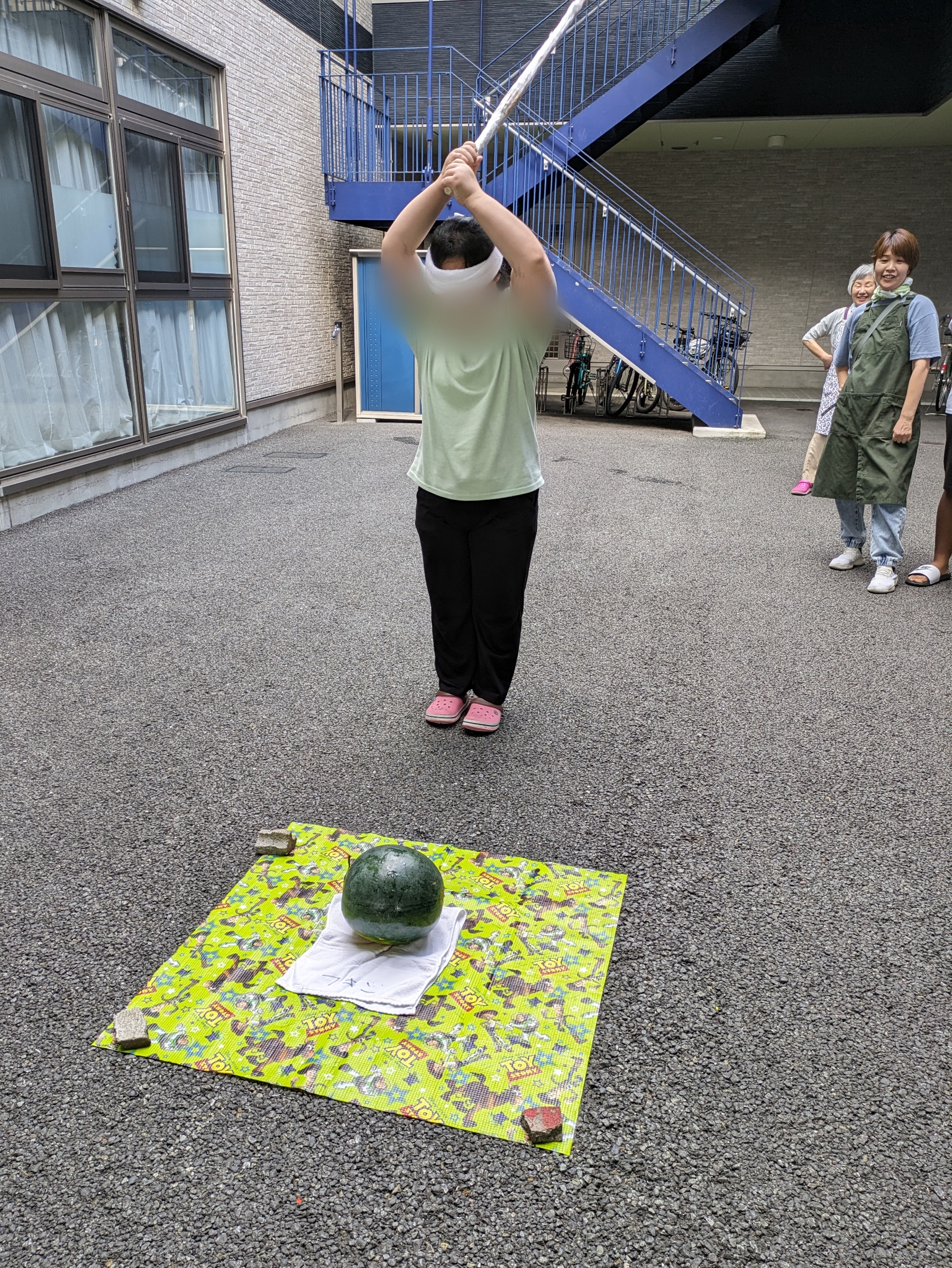 すみれユニットとあすなろユニットのスイカ割りの様子です。