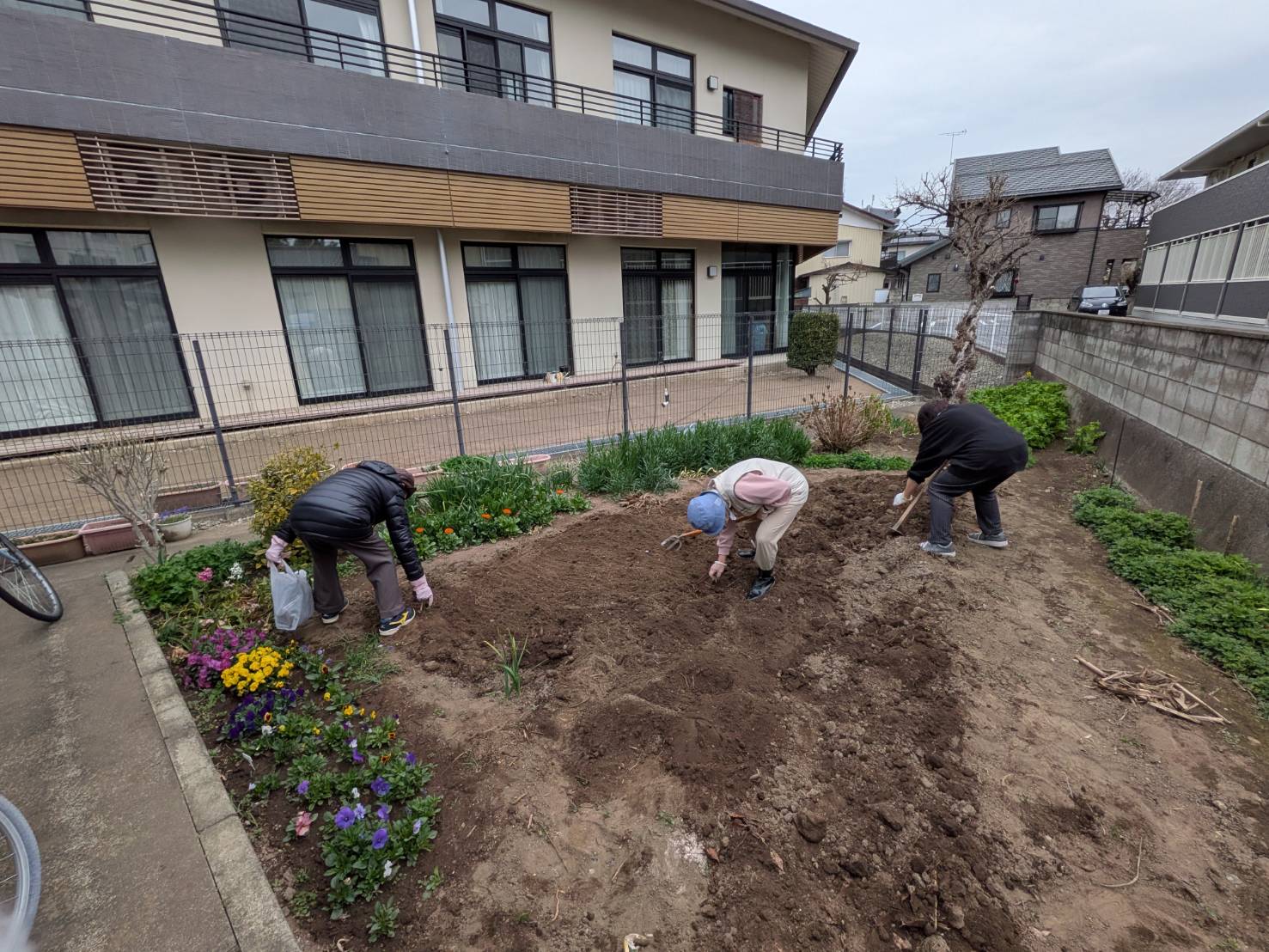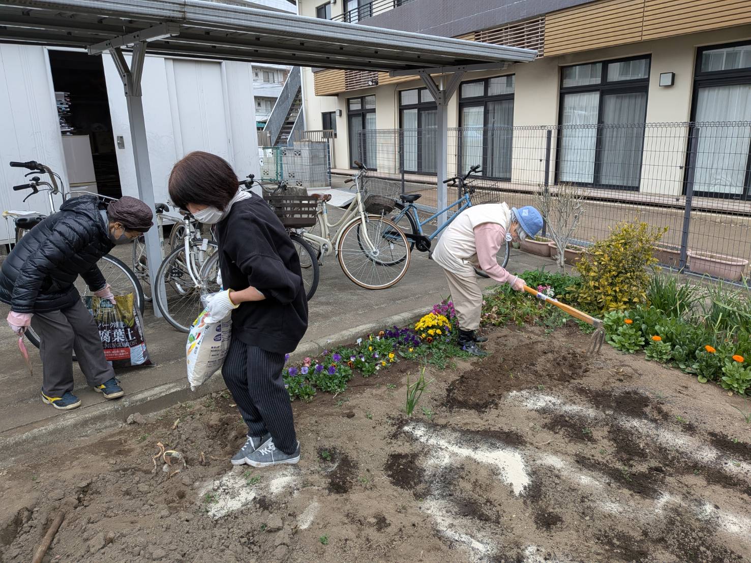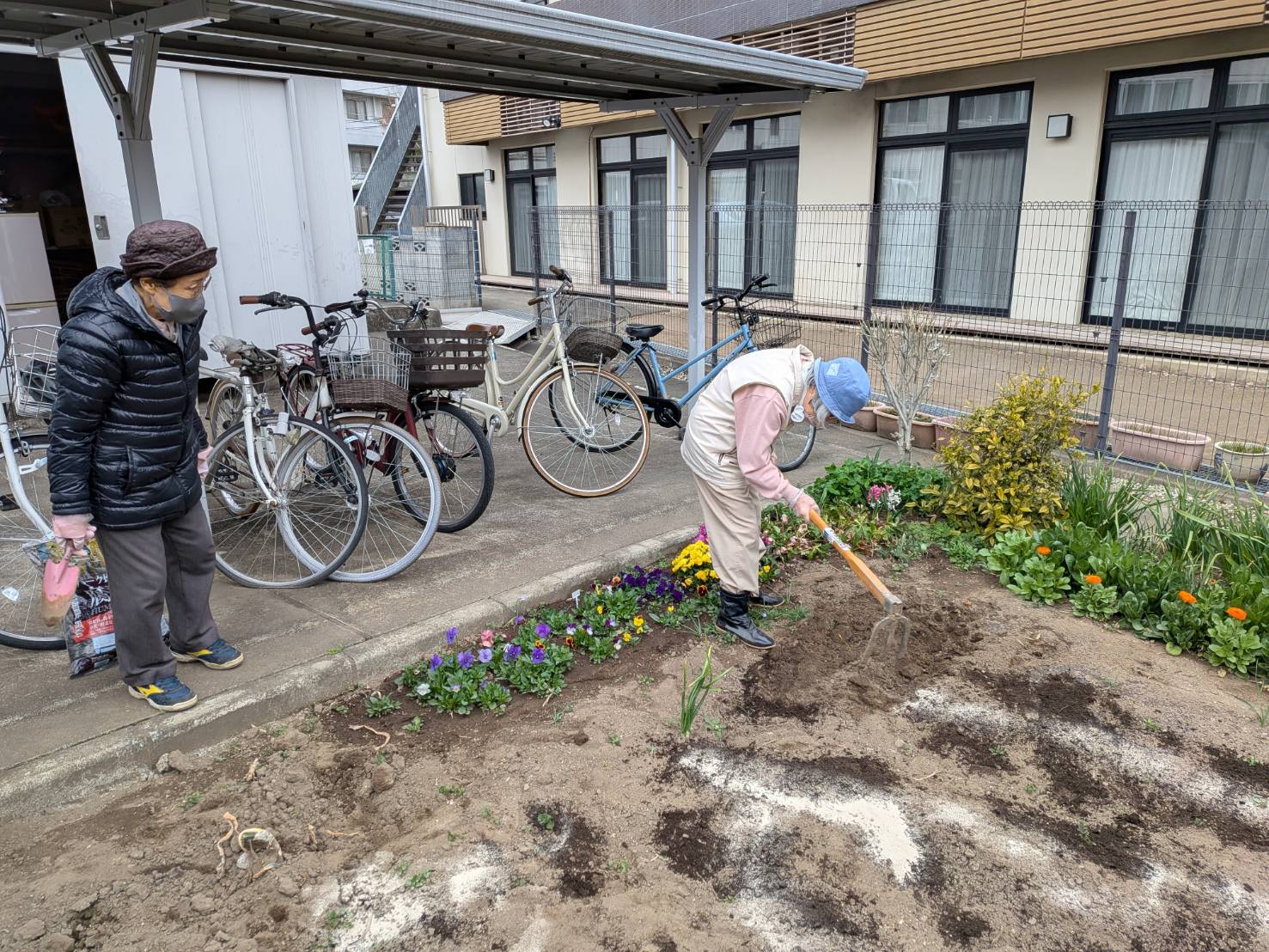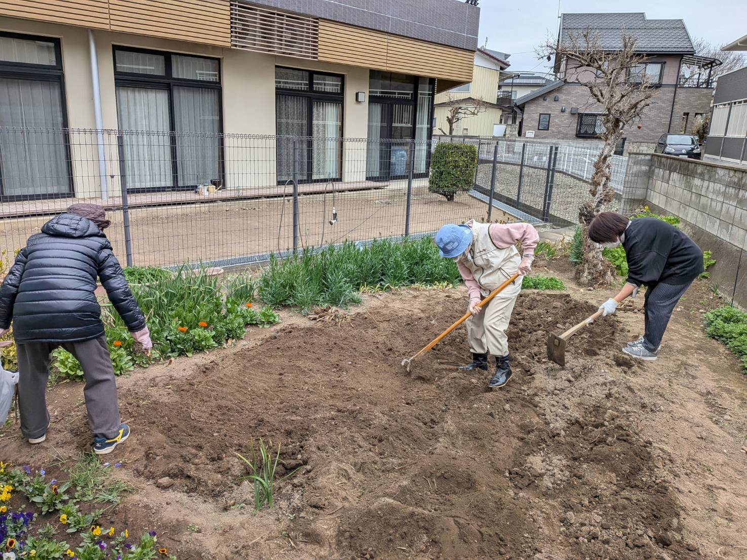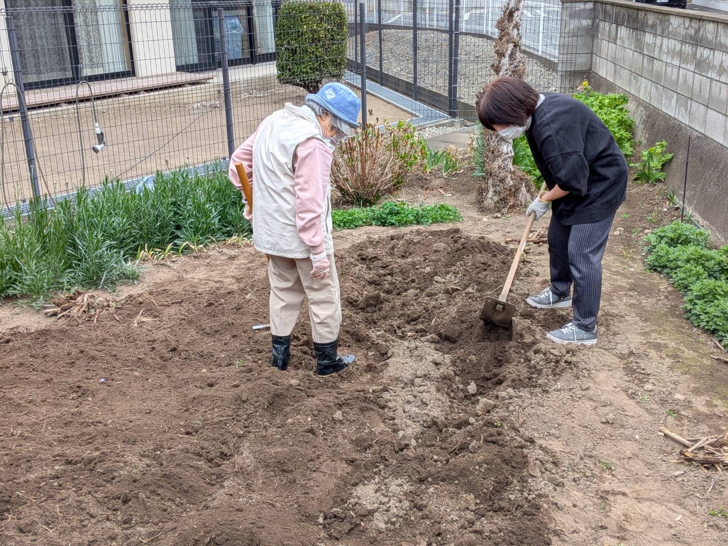 3月20日(金)午前中、前からお約束していたお花大好きな入居者さんたちと施設長、職員で腐葉土と石灰をまき、耕しました。手際よく良い畑が出来ました。明日、種まきします。ケアハウスホープヒルズ