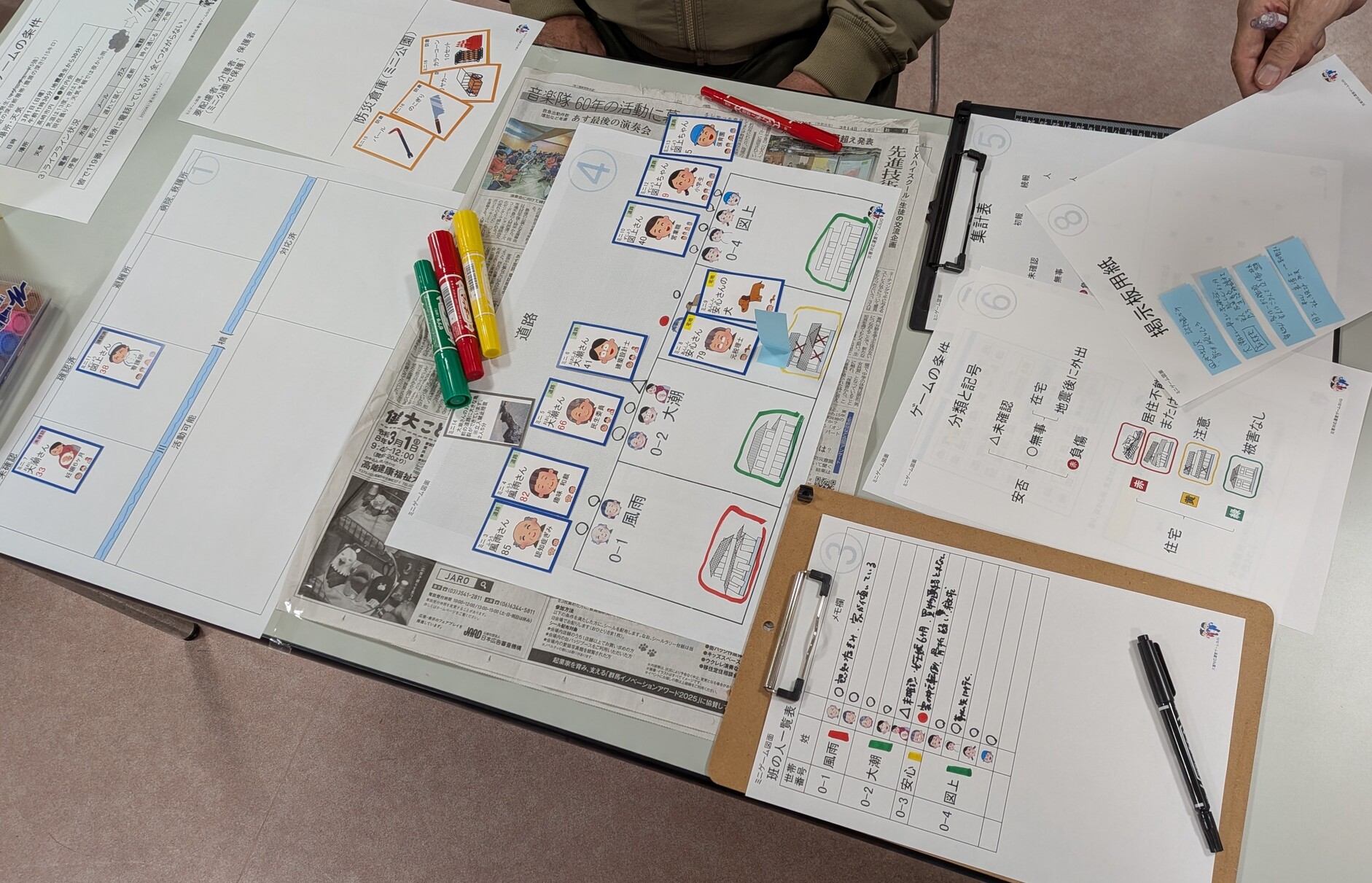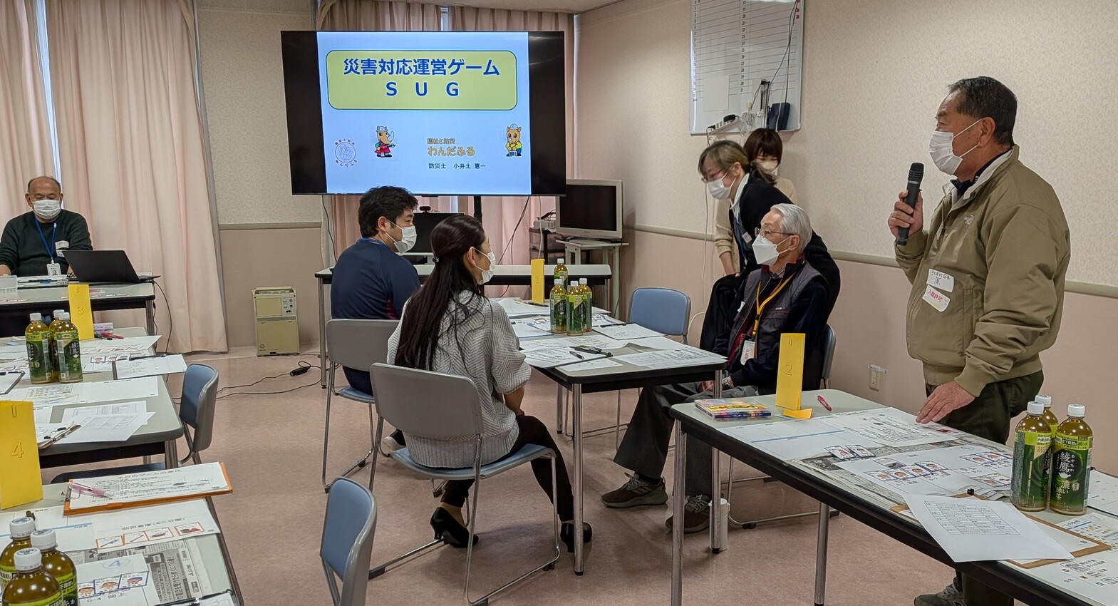 SUGは大災害発生時の地域住民の協力活動を地図やカードを使って模擬体験する防災ゲームです。認知症の高齢者、妊婦や保育園児がいる世帯があり、家屋の損壊状況をみて、どこに避難誘導するか、二次避難はどうするかをチームで考えていきます。